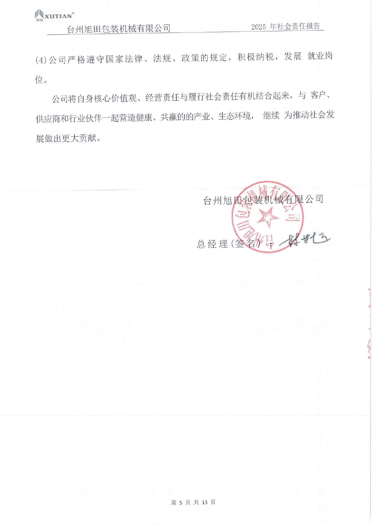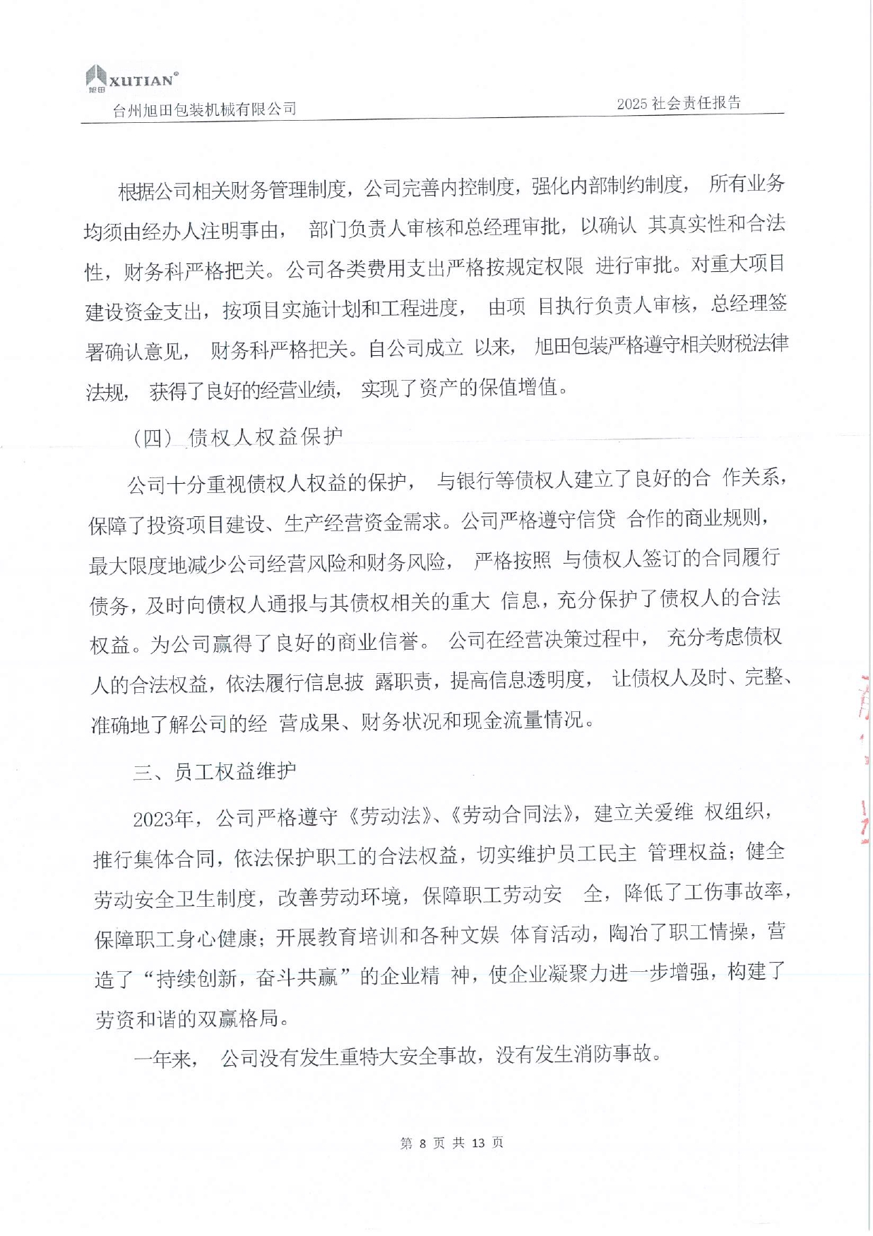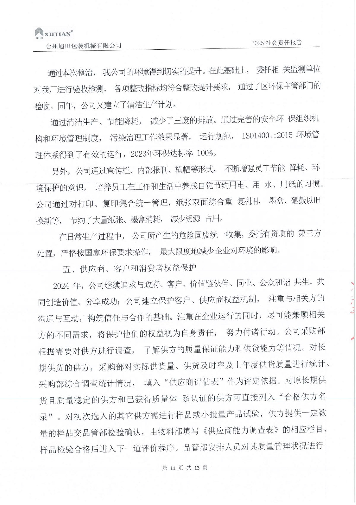 臺(tái)州旭田包裝機(jī)械有限公司自成立以來,始終秉持“誠信為本,追求卓越”的企業(yè)宗旨,積極履行企業(yè)社會(huì)責(zé)任,致力于實(shí)現(xiàn)企業(yè)與員工、客戶、社會(huì)及環(huán)境的和諧發(fā)展?,F(xiàn)將2024年度社會(huì)責(zé)任履行情況公示如下: